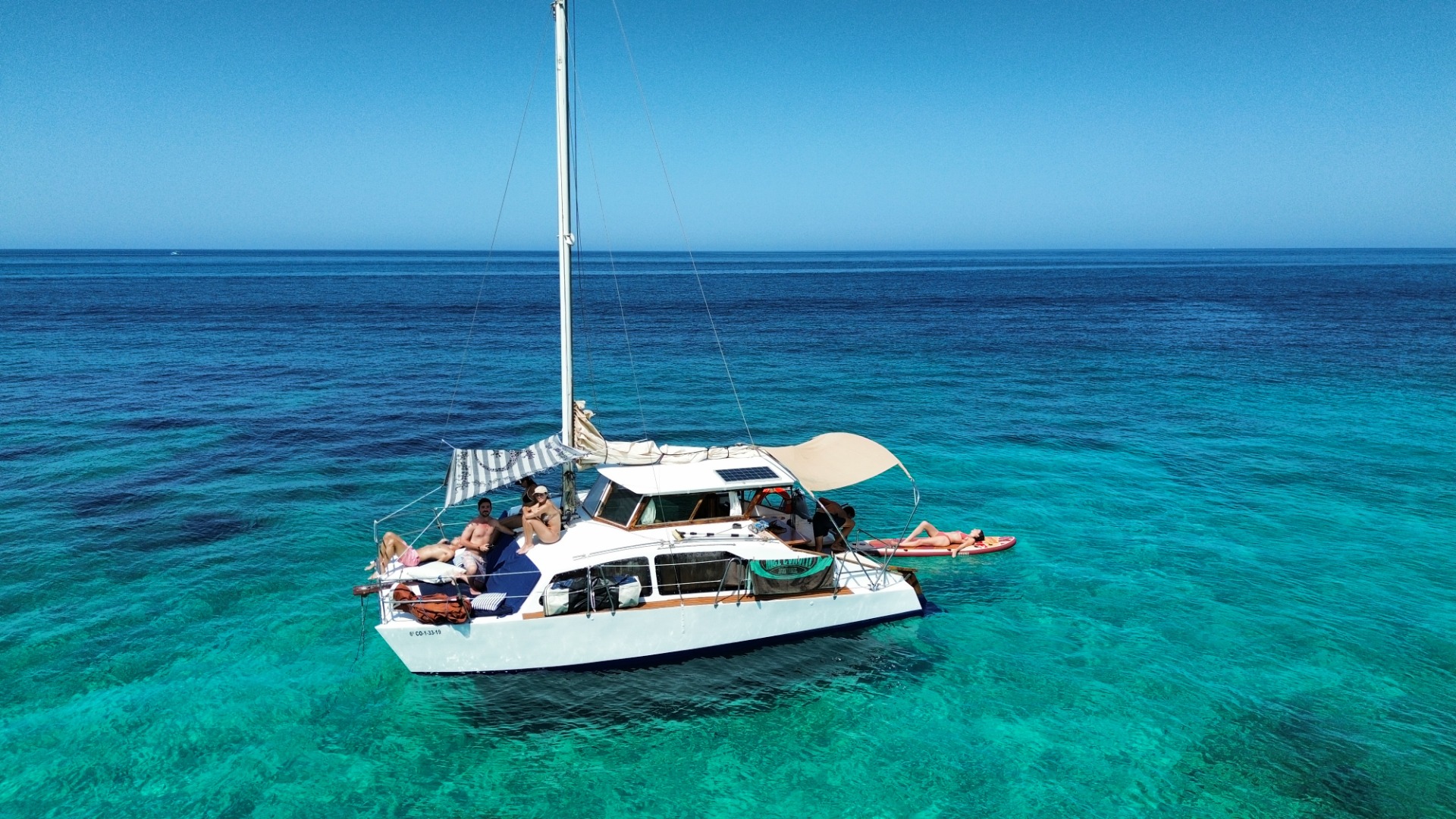Imagina un día navegando en un catamarán clásico de 1967, con el viento en la cara, el sonido del agua acariciando el casco y un mar de color turquesa extendiéndose ante ti.